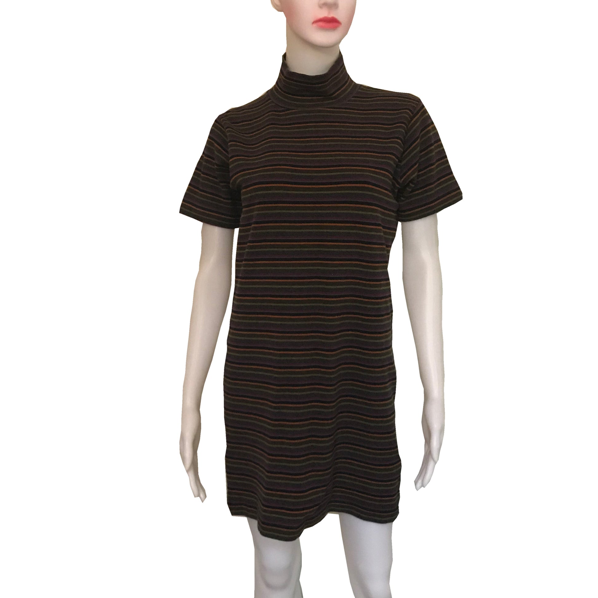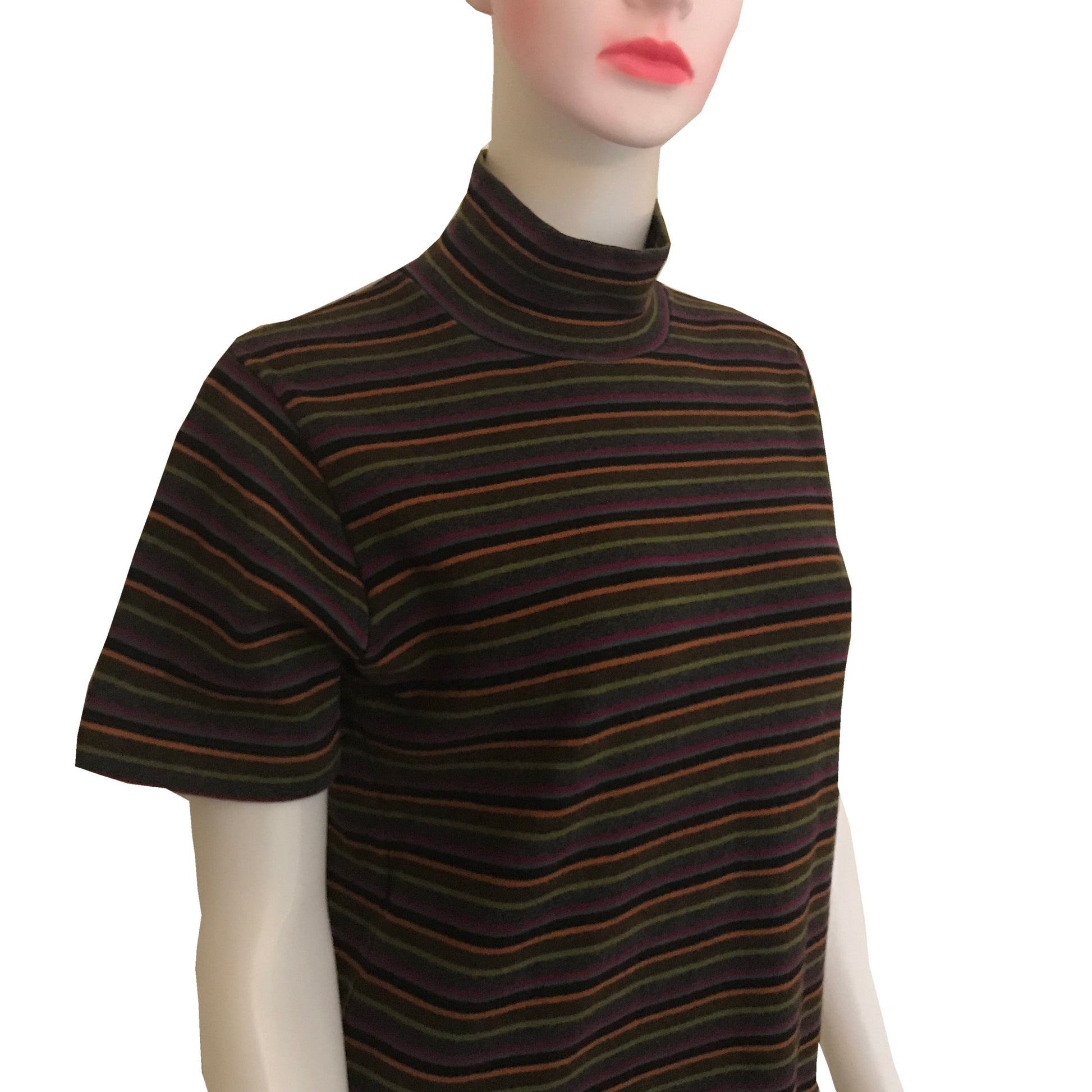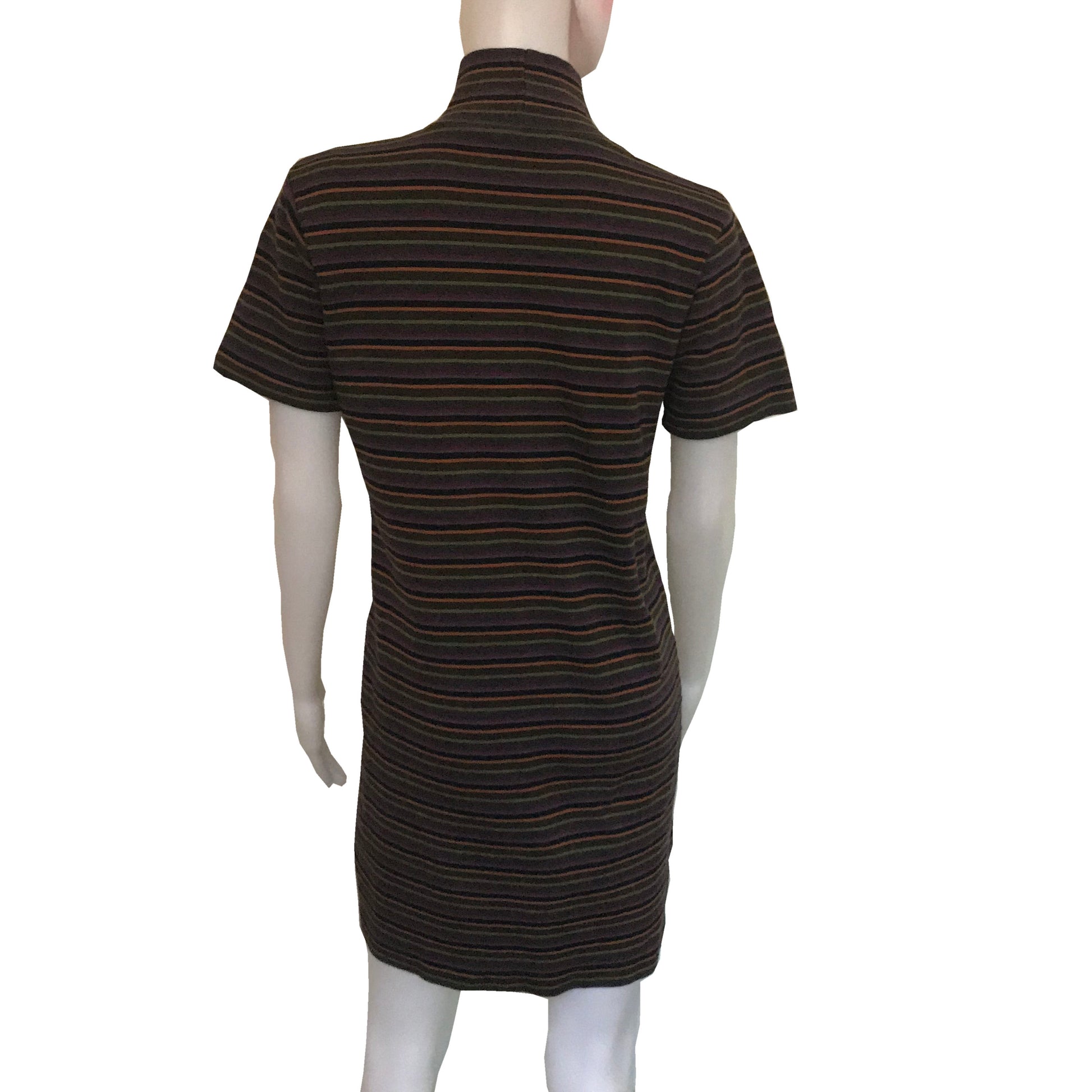 Adorable mod striped mini-dress circa 1960s. Mock-turtleneck cotton mini with horizontal stripes in gray, black, orange, green and purple. Short sleeves. Unlined. Slips overhead - no zipper. Heavy cotton material. In excellent vintage condition.