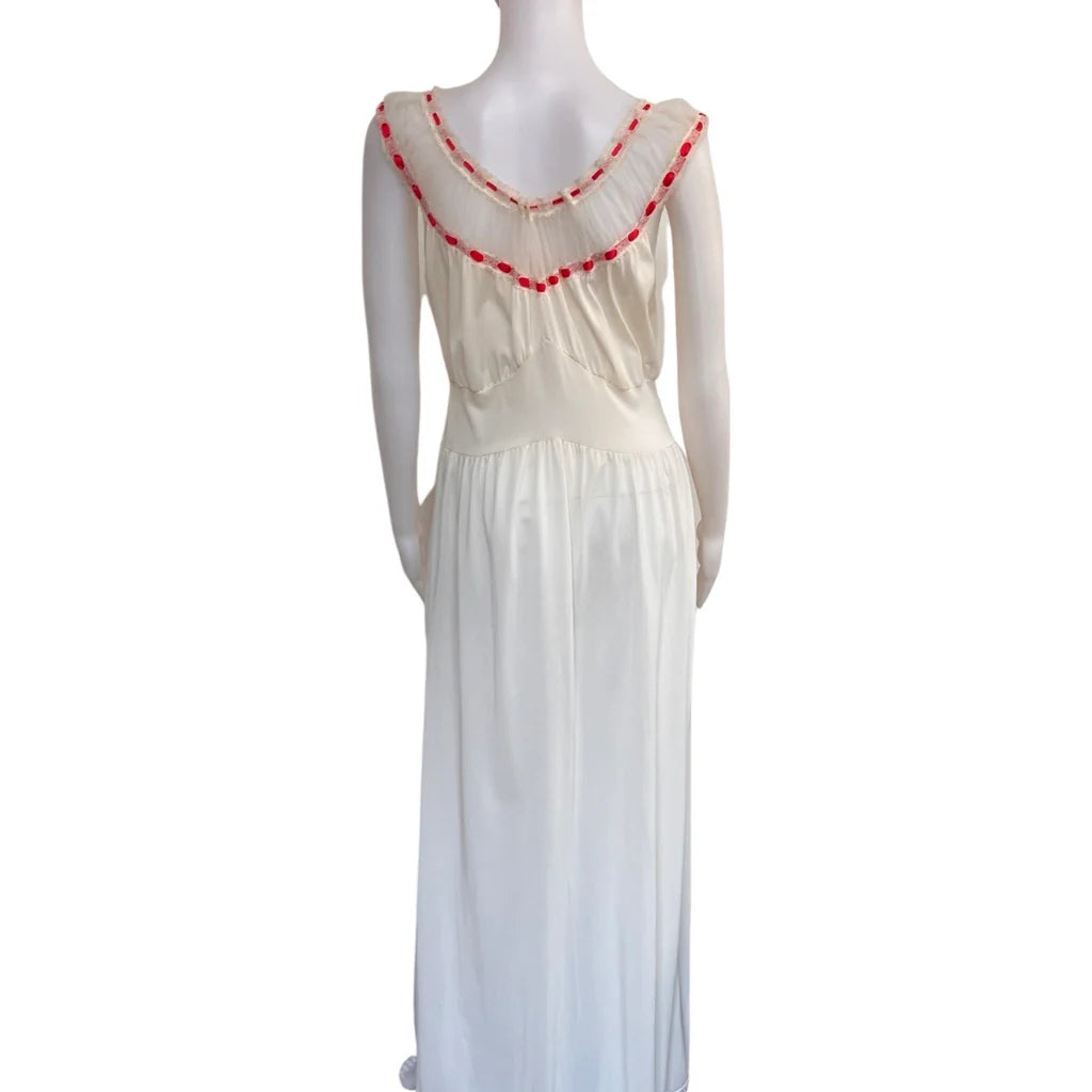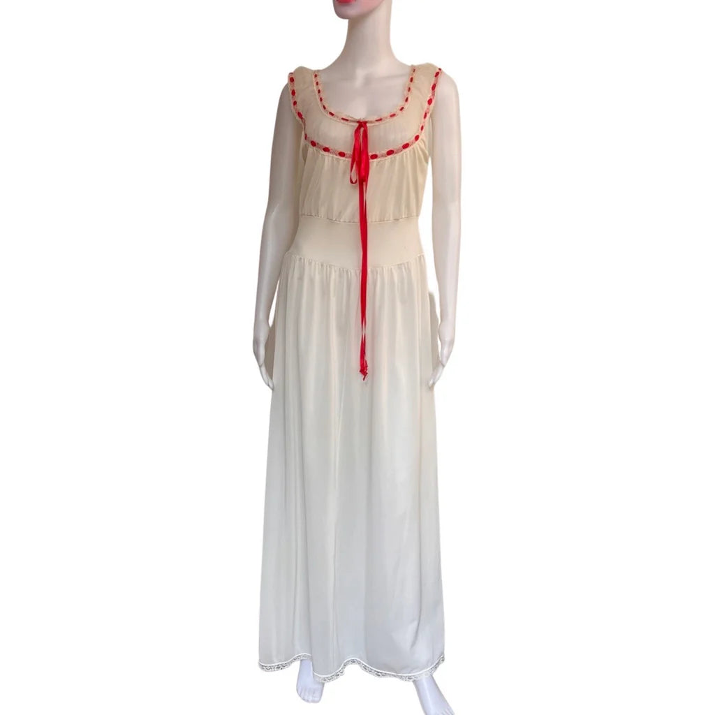 Extremely rare full-length vintage 1950s Van Raalte Myth nightgown in cream with red satin ribbon accent. Nylon material. Size Large.