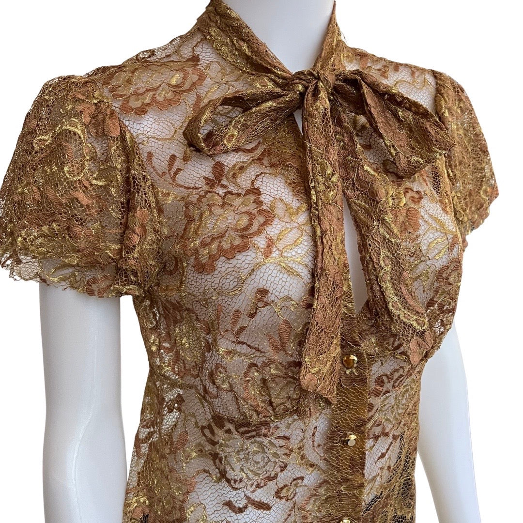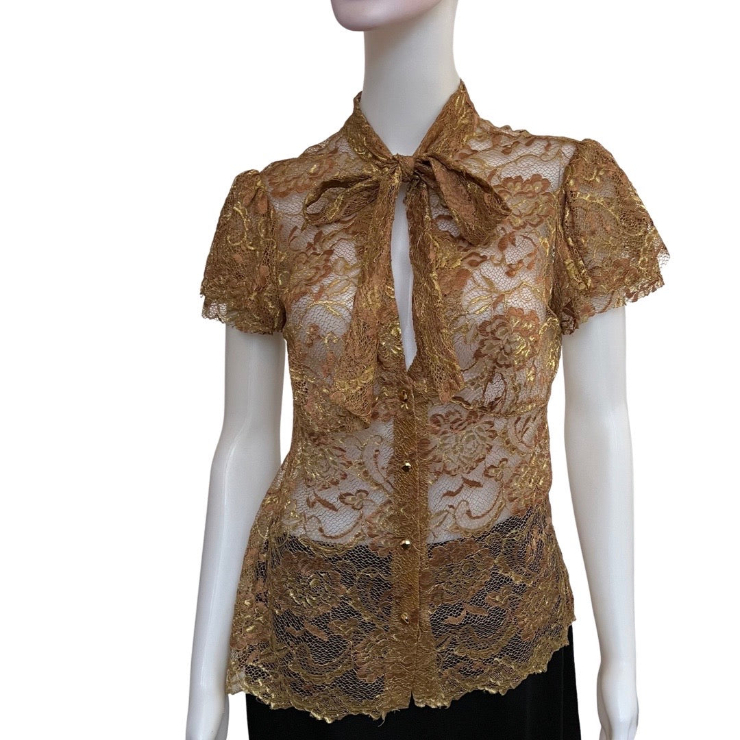 Stunning gold lace button down pussybow blouse from Trina Turk. Size Medium.