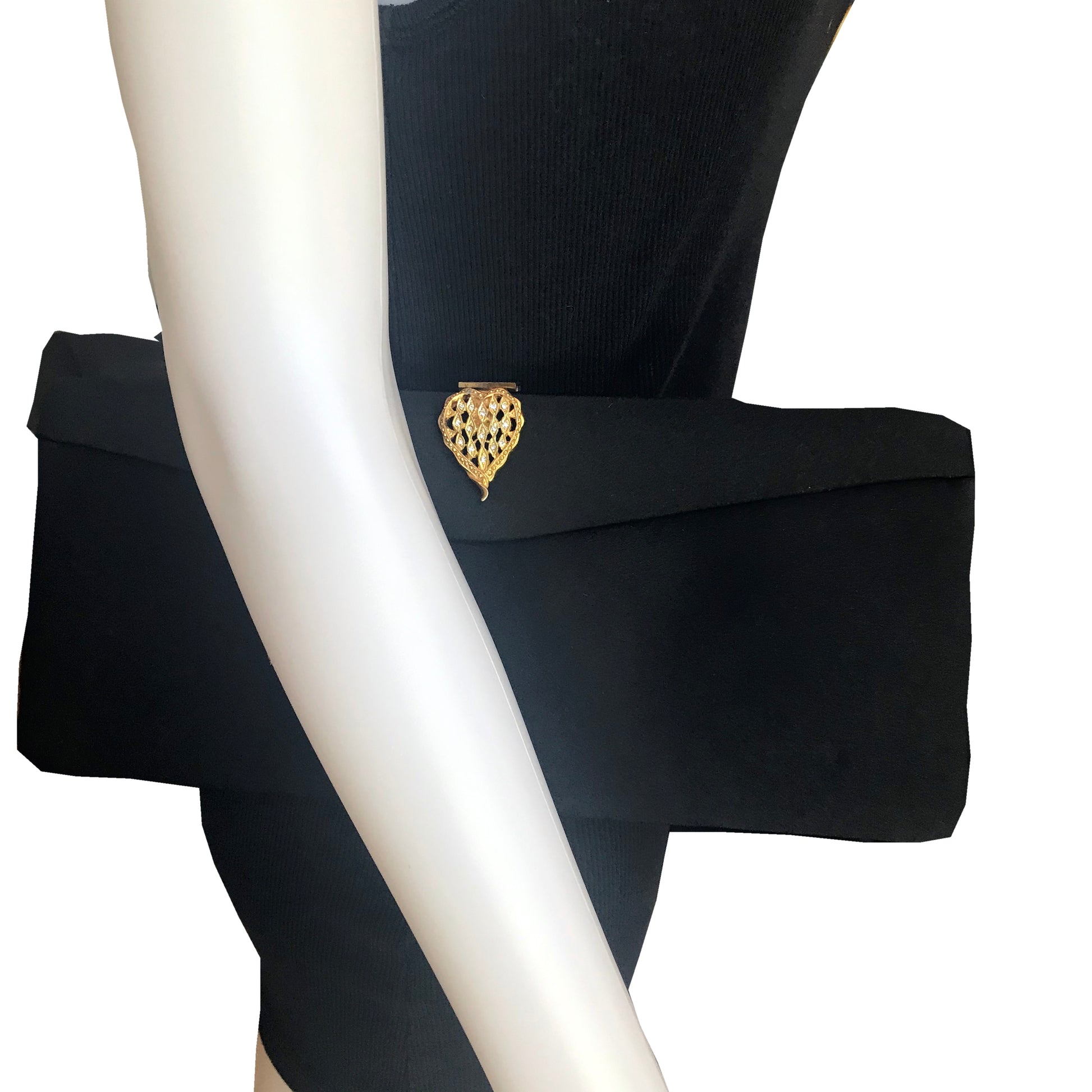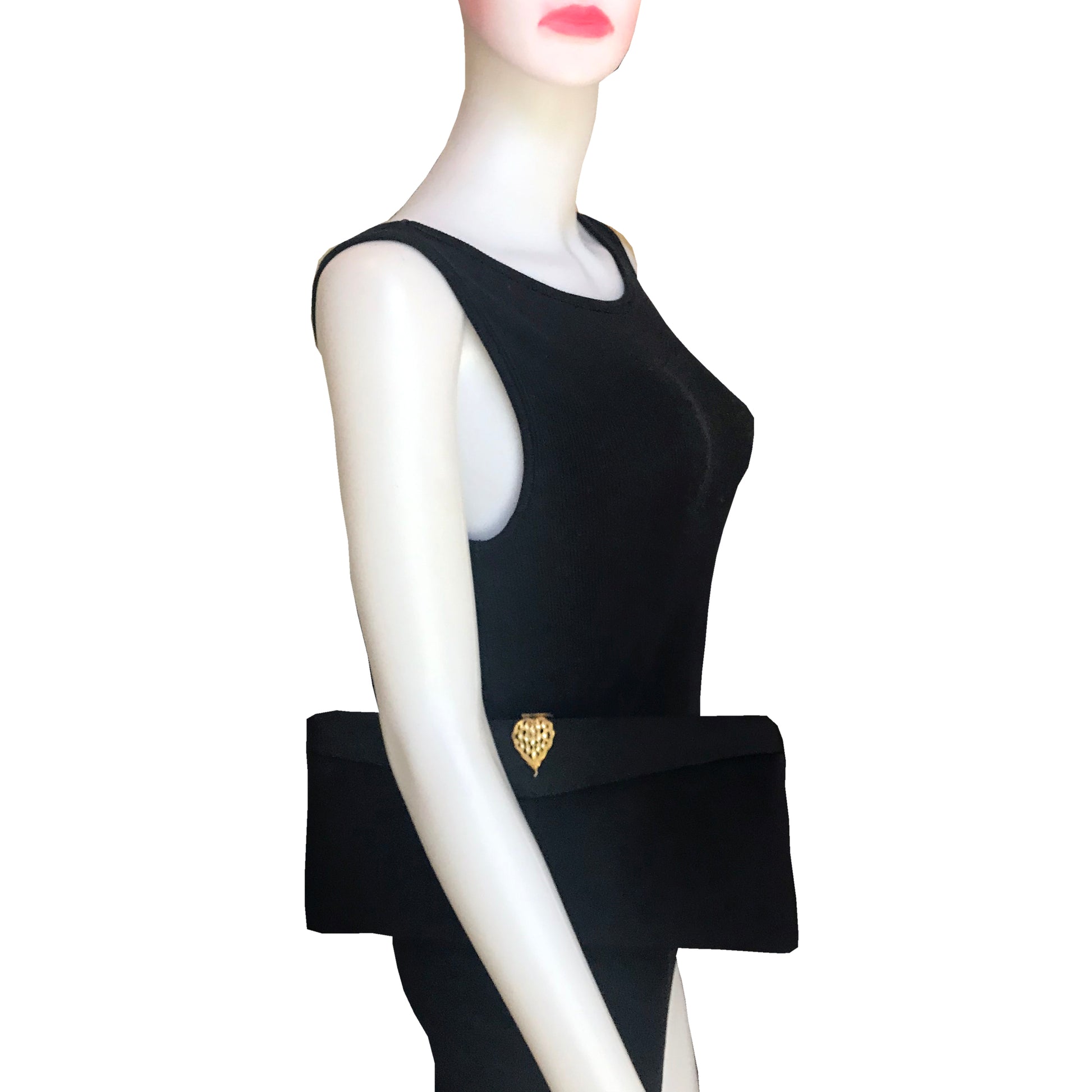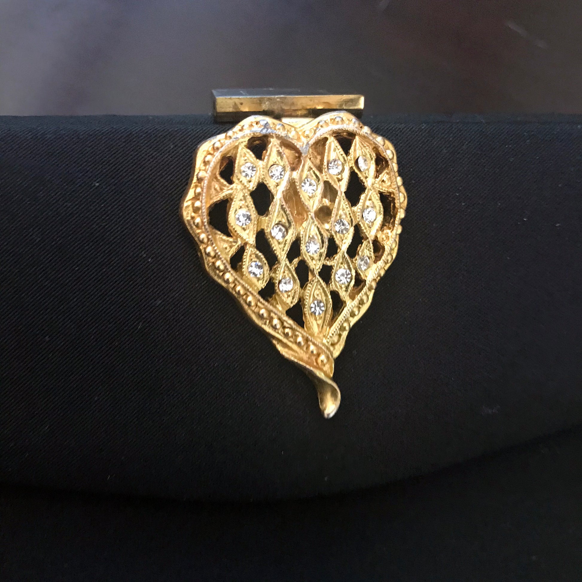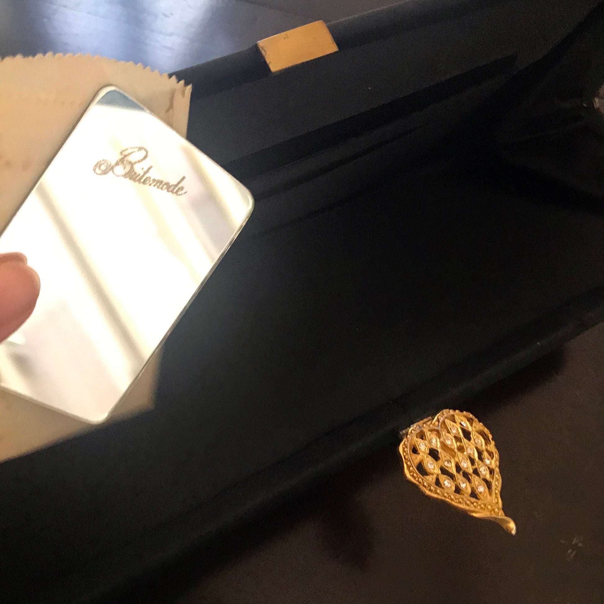 Stunning vintage 1950s Britemode black satin clutch bag with gold jeweled and crystal heart clasps. Satin lined interior features two open sleeves with compact mirror.