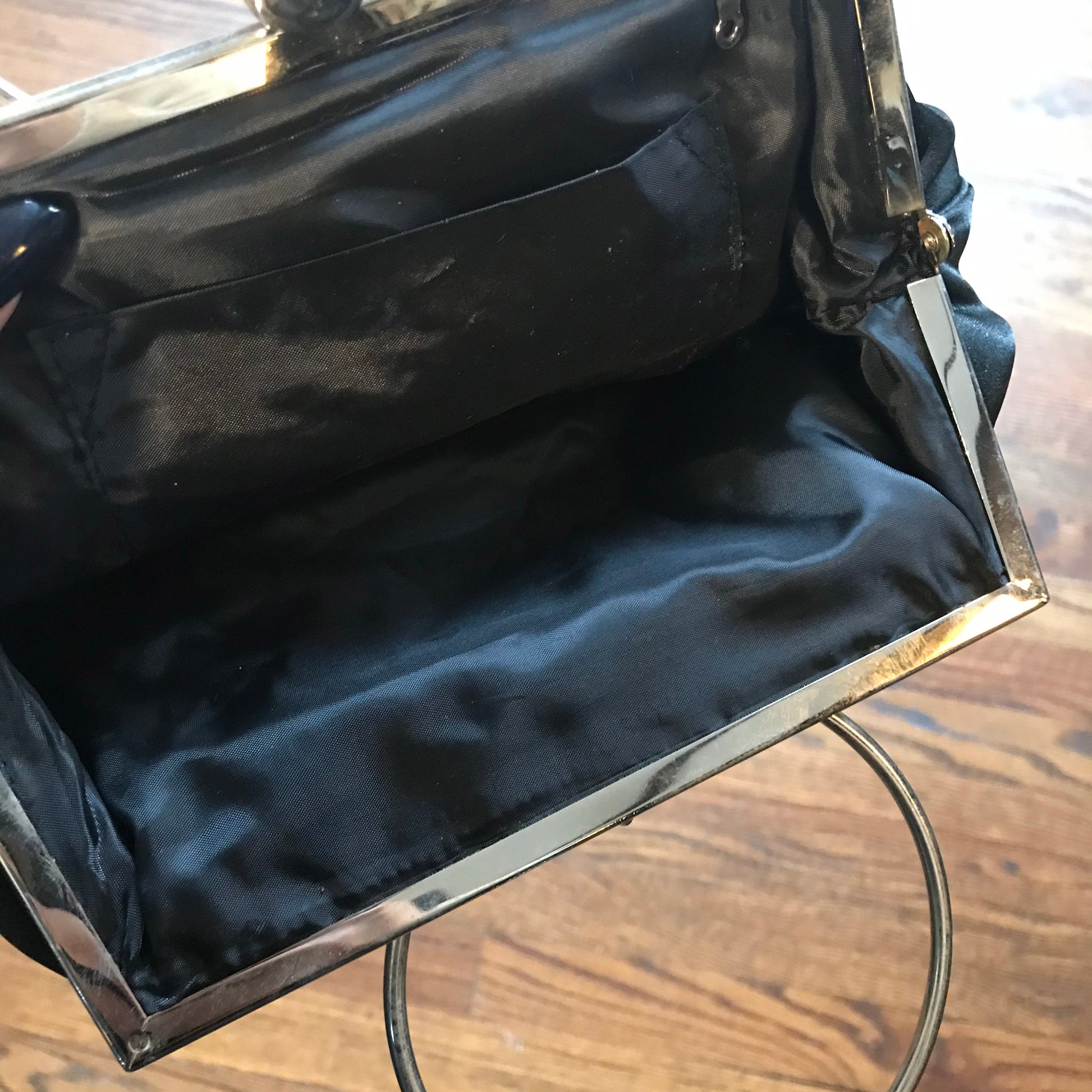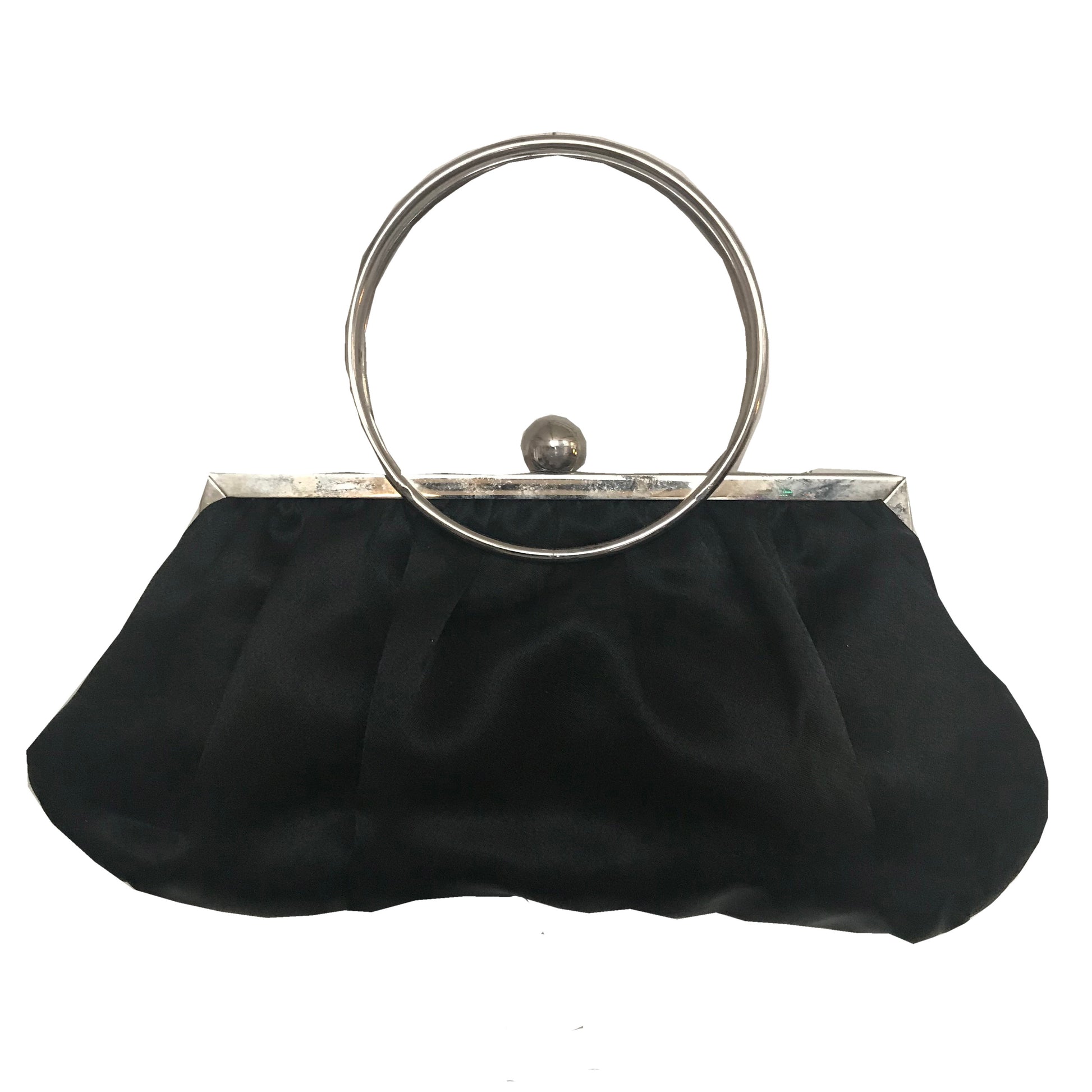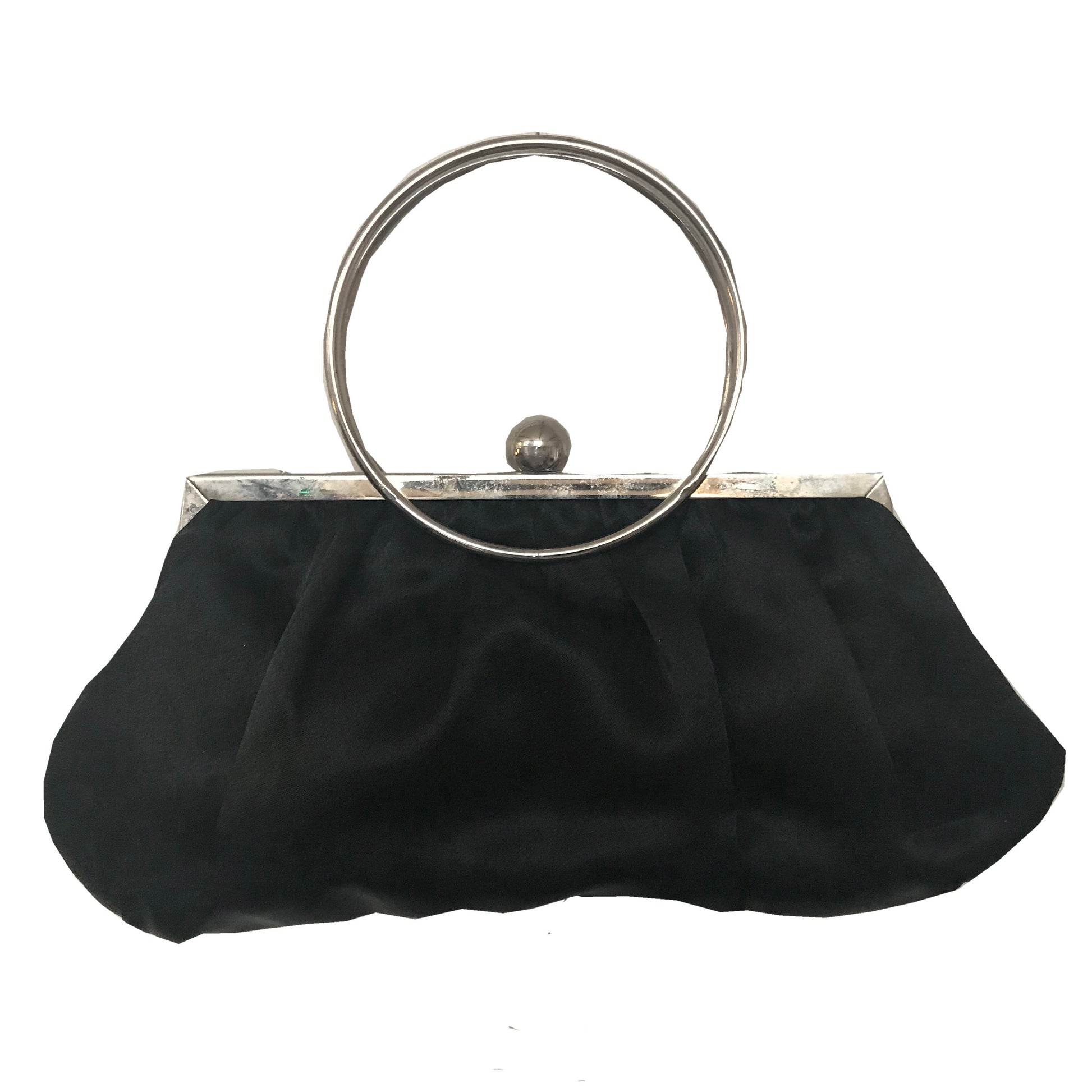 Rare vintage 1950s satin evening clutch bag with silver circle handle. Button top lock. One inside pocket. In excellent vintage condition.