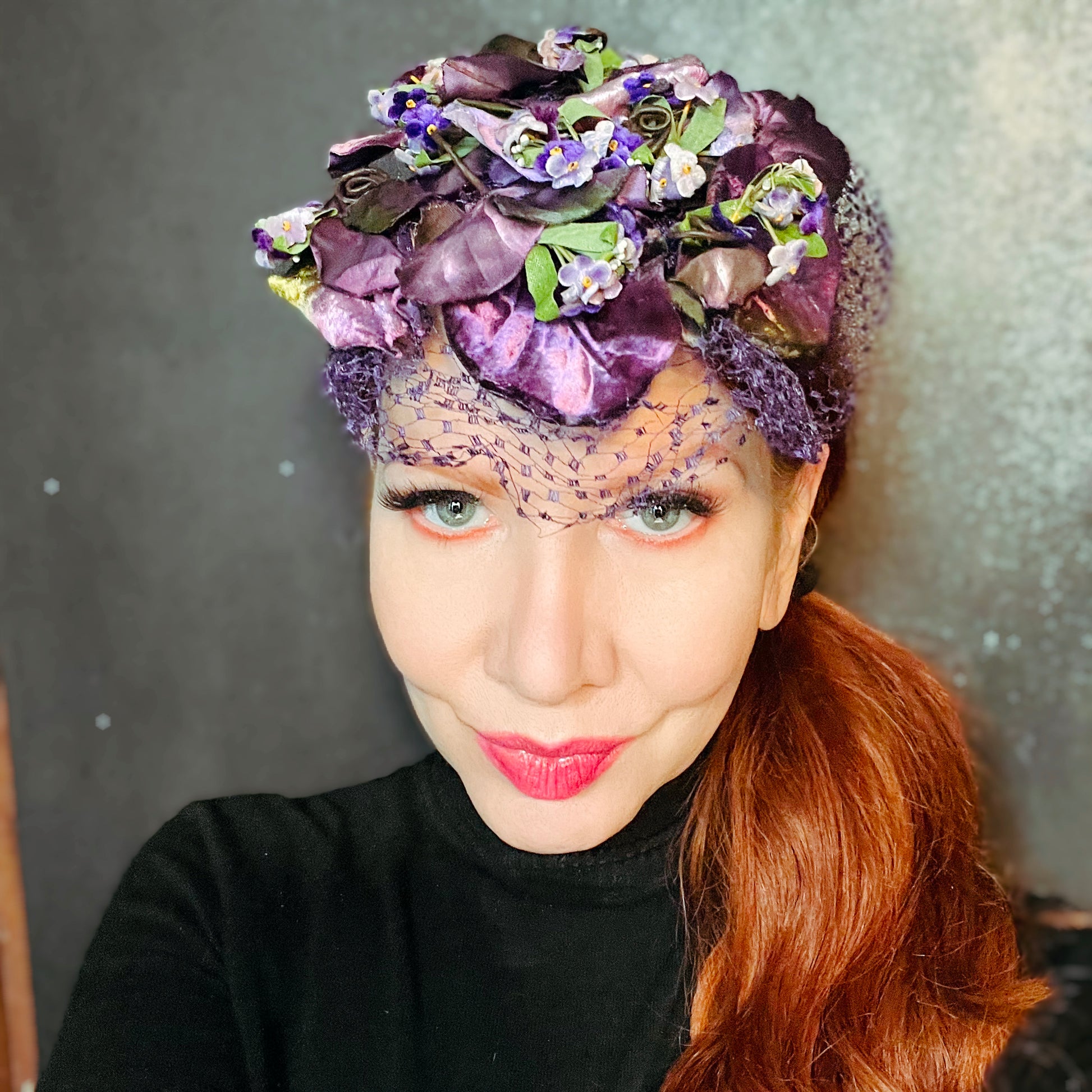 Vintage 1950s purple silk whimsy flower hat with veil. 10" inch diameter. Some of the netting is torn, but otherwise in excellent vintage condition.