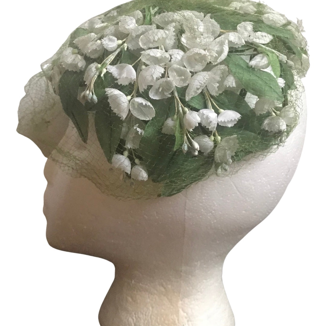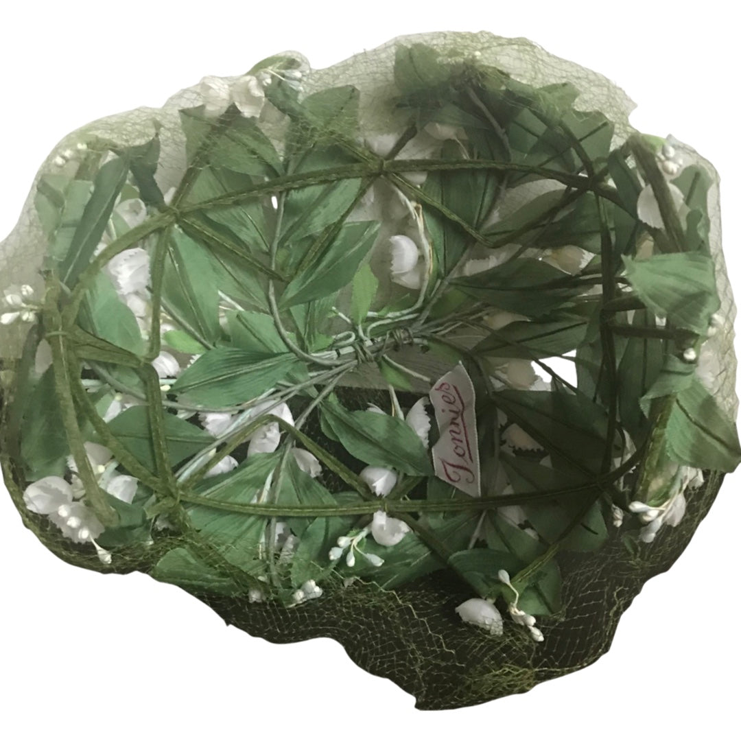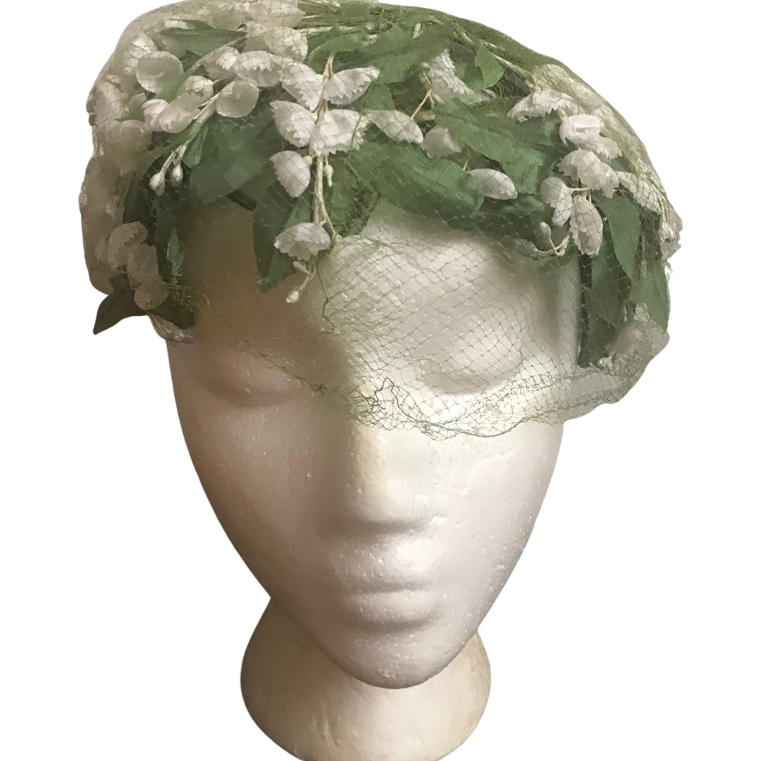 Vintage green and white Tonnies silk floral whimsy hat with netting. 4" height - 8 1/2" diameter.