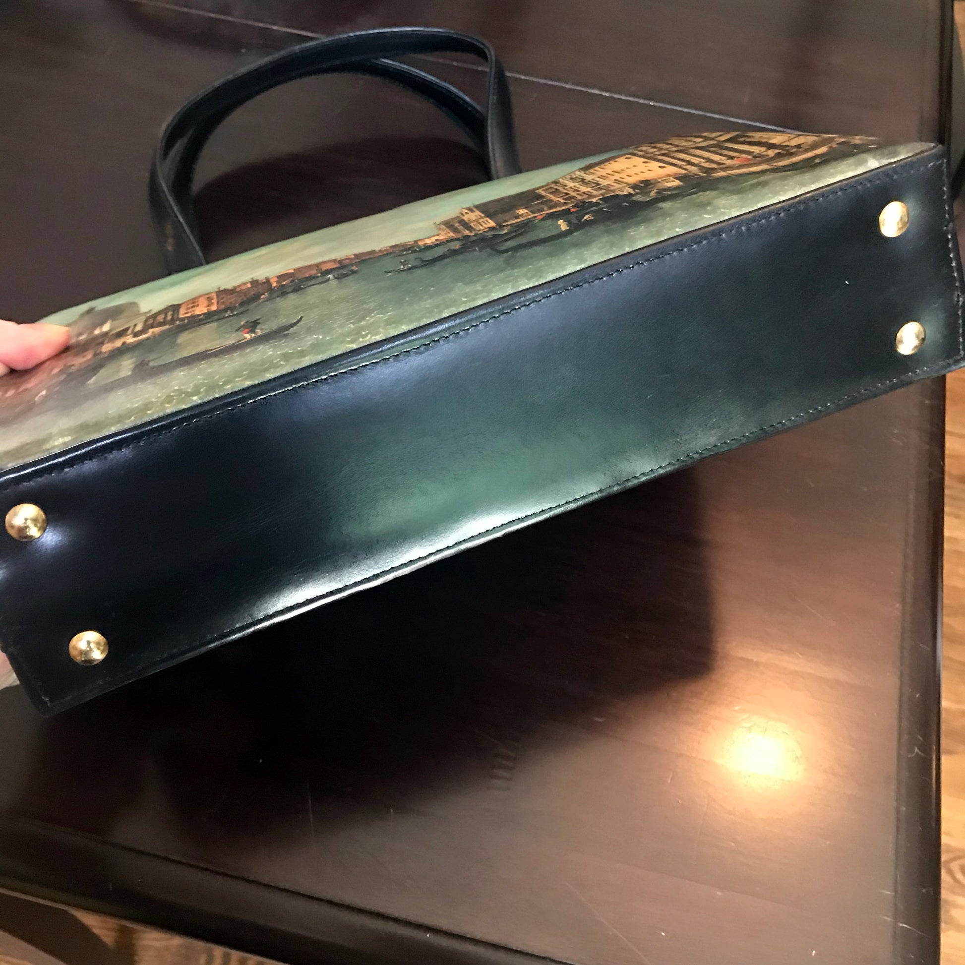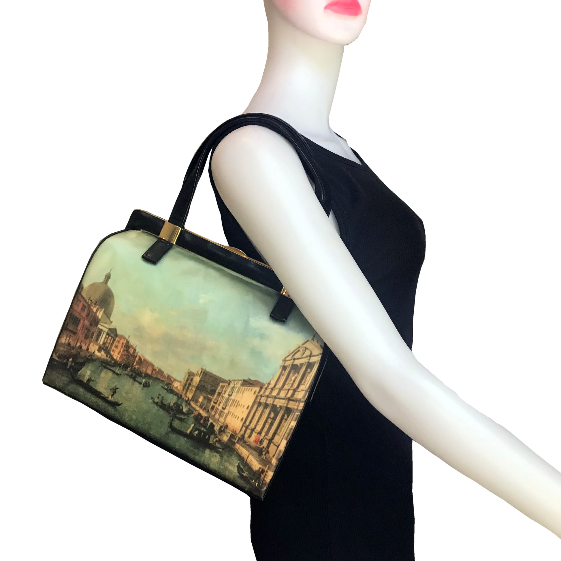 Extremely rare vintage 1950s Tano of Madrid top-handle leather bag with silk print of Venice canal and gold hardware. Leather lined interior features one zippered compartment and one open sleeve. Matching change purse included.