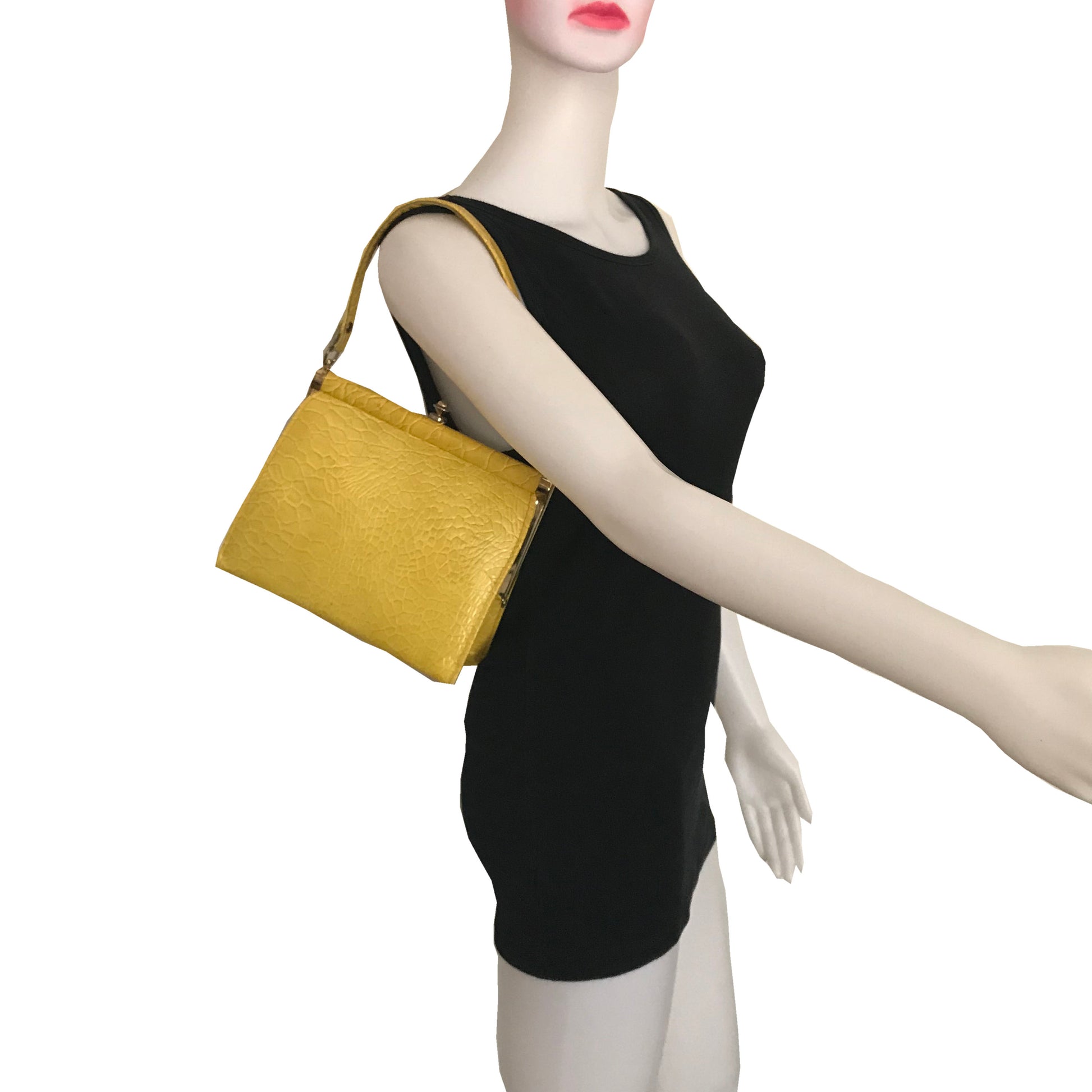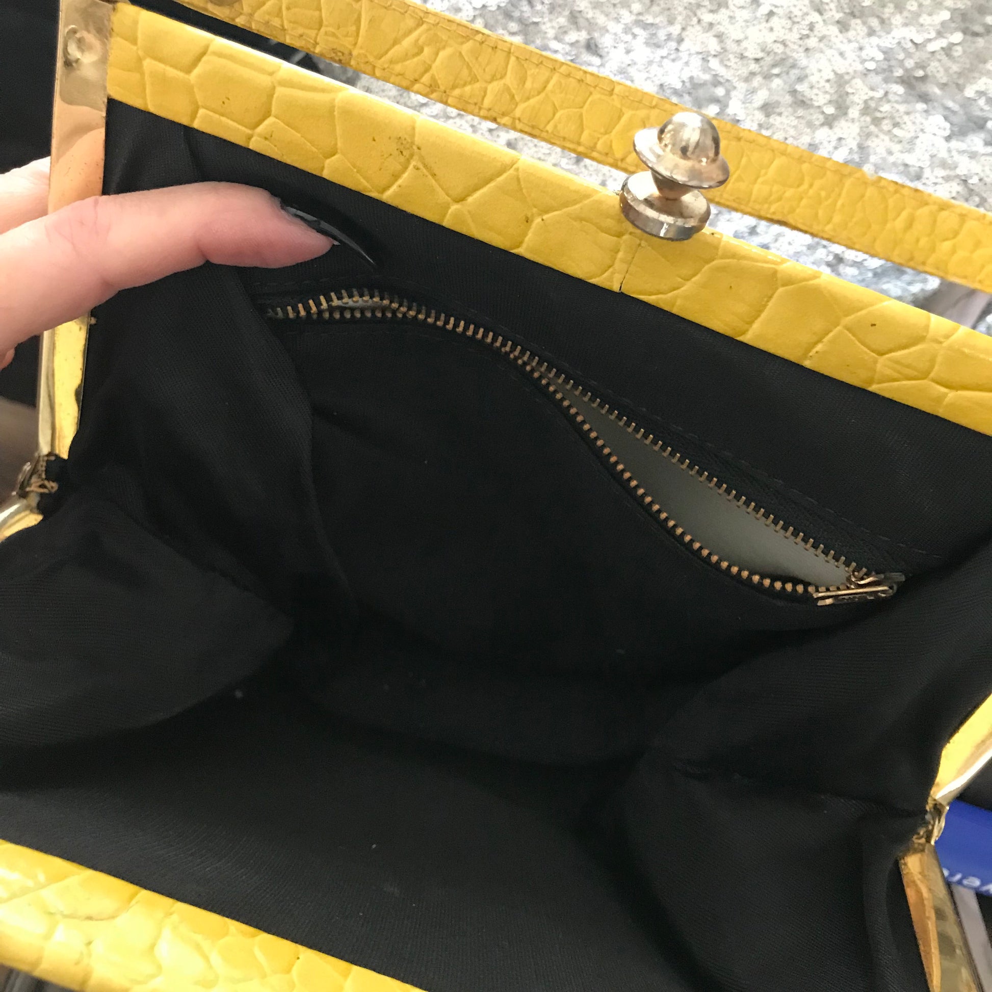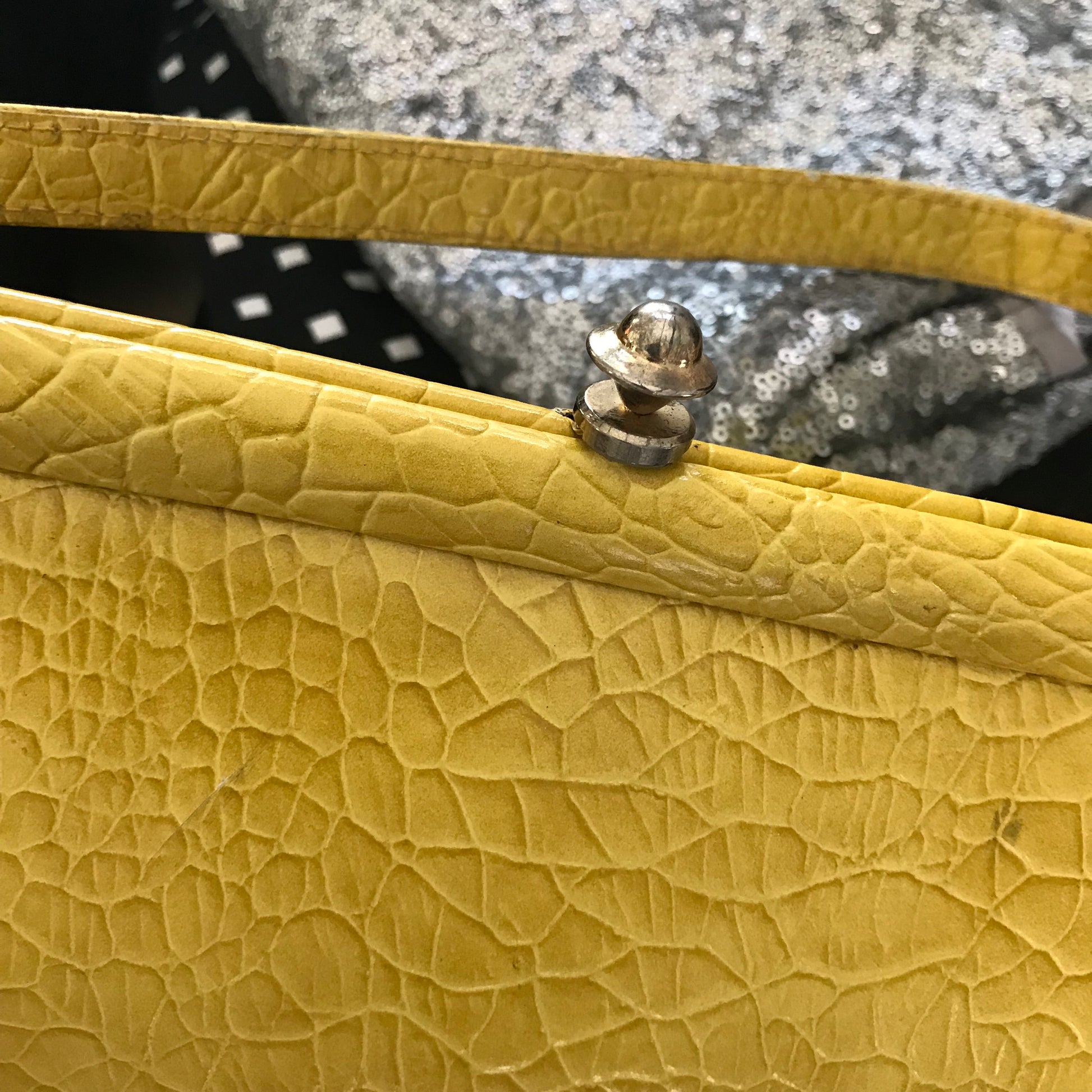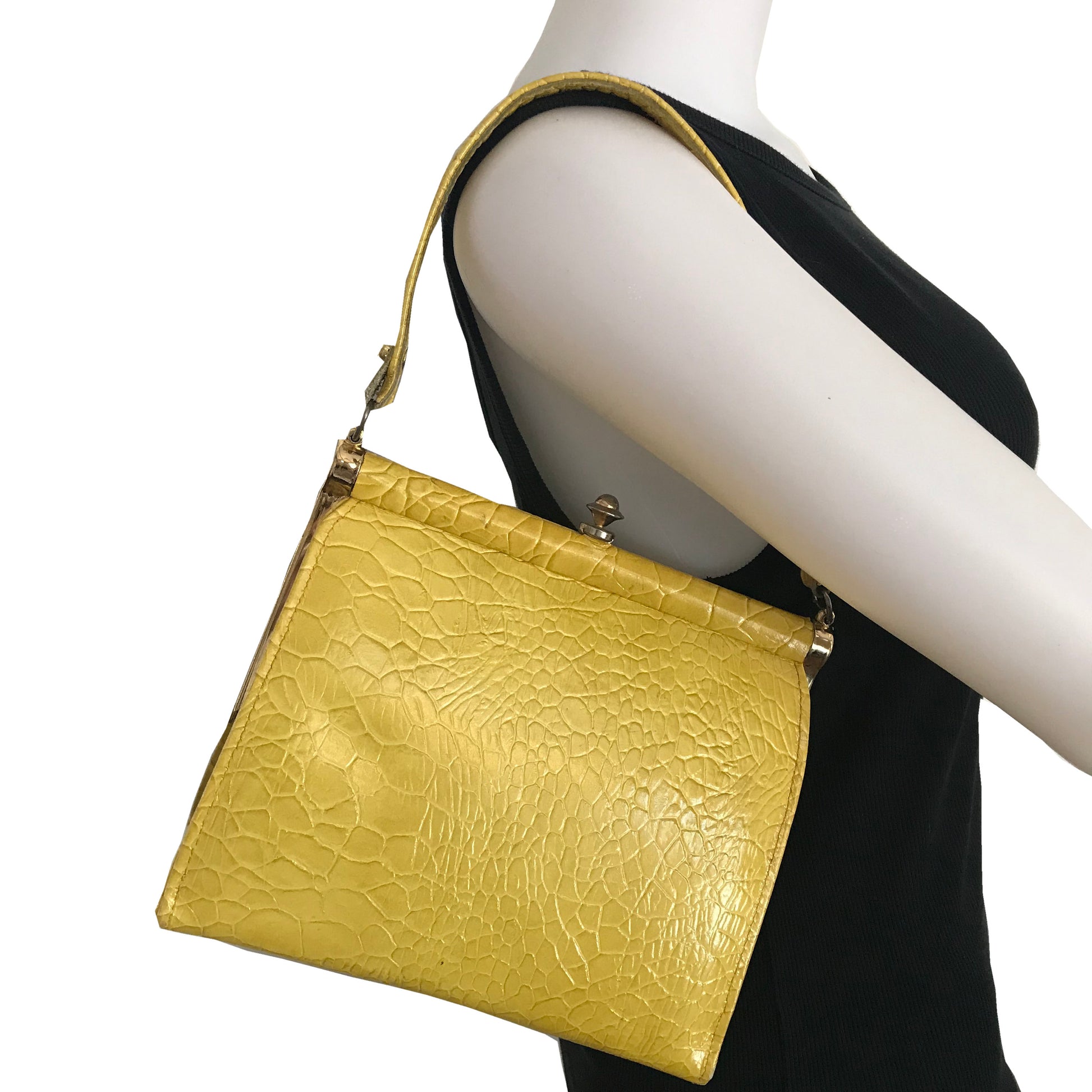 Beautiful vintage 1950s top-handle purse. Bright sunny yellow color leather bag with mock-crocodile embossed print. Gold hardware with round top closure. Black satin inner lining. Inside features one zippered compartment. In excellent condition - no makeup or any other types of stains.