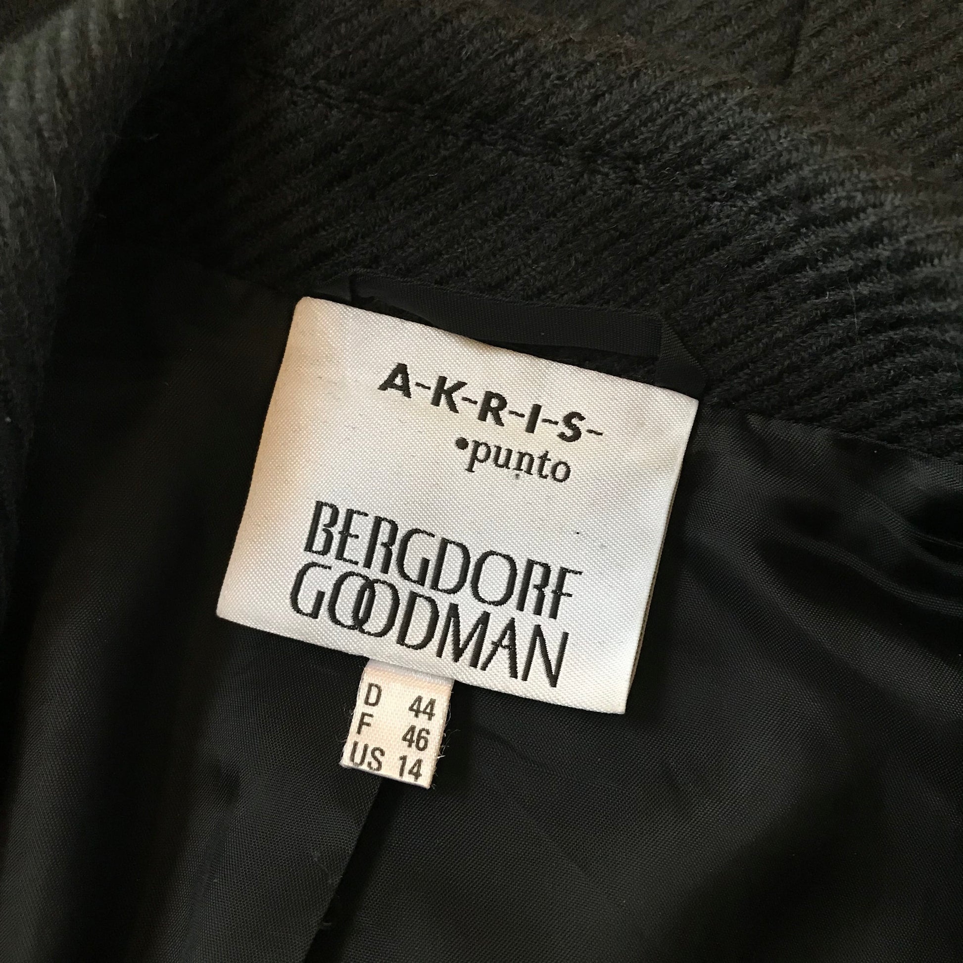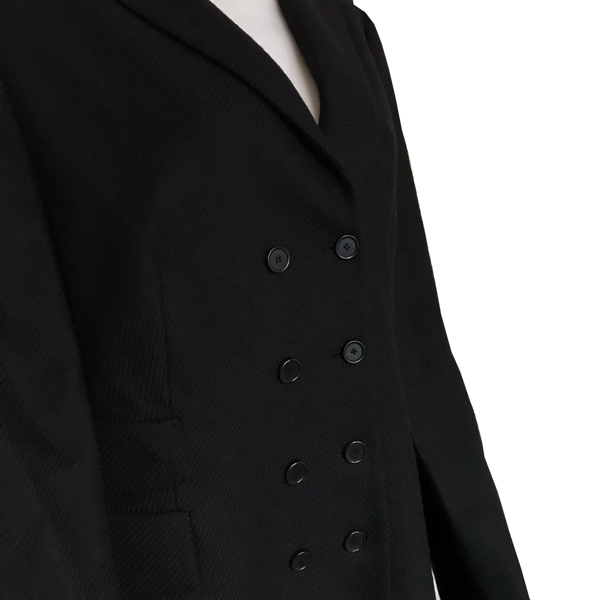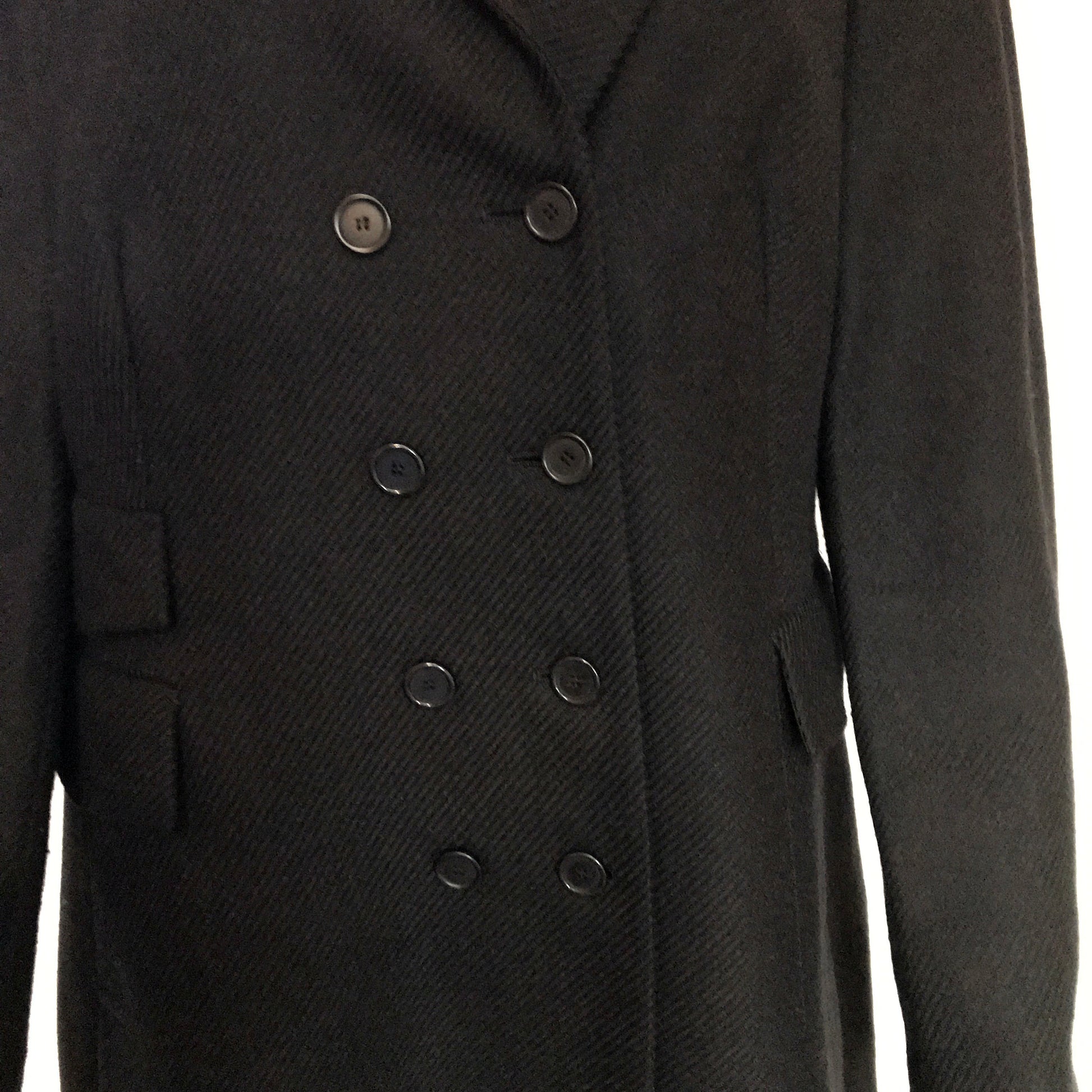 Vintage 1990s Akris Punto black wool coat with notch-lapels, flap pockets at front and double-breasted button closures. Size 14/XL