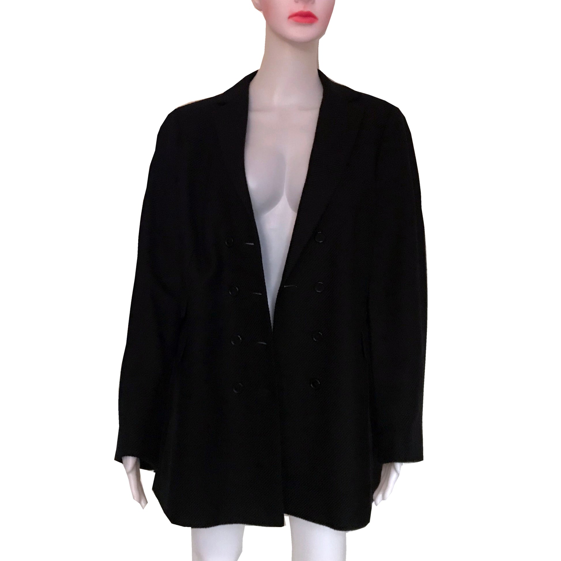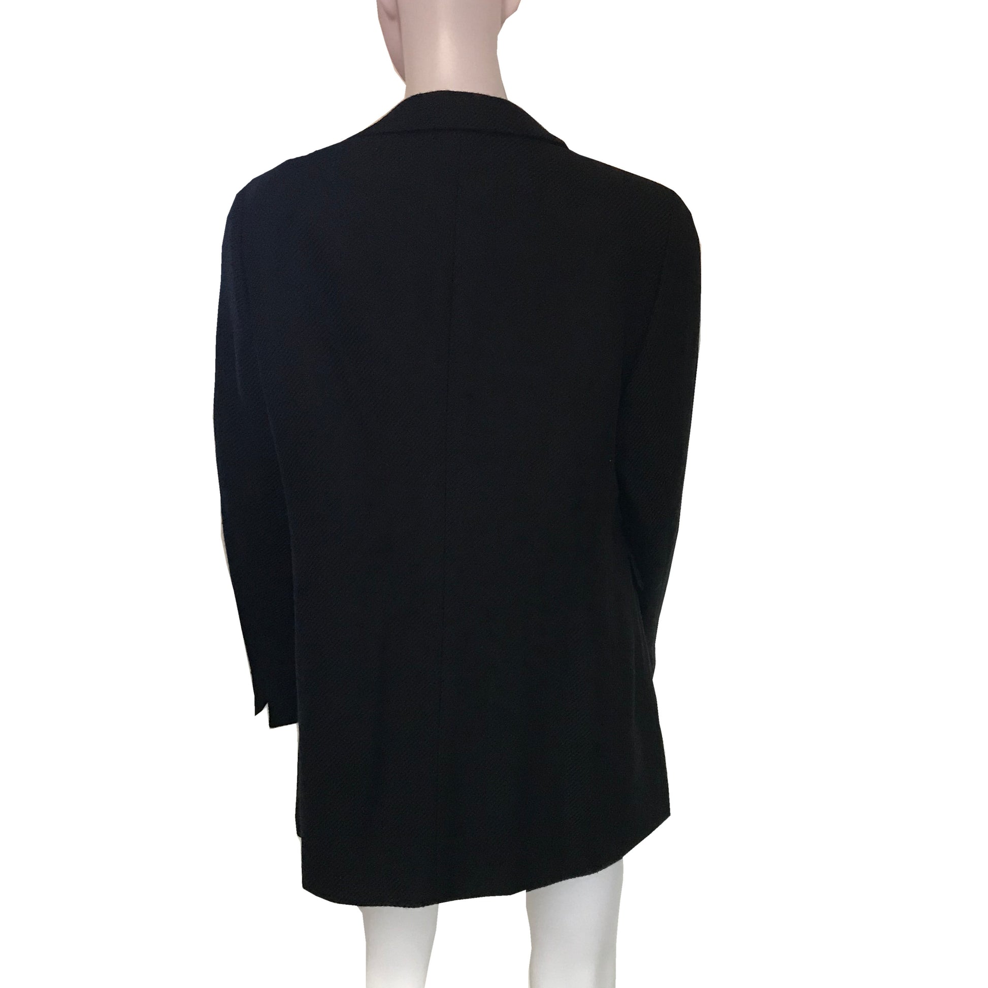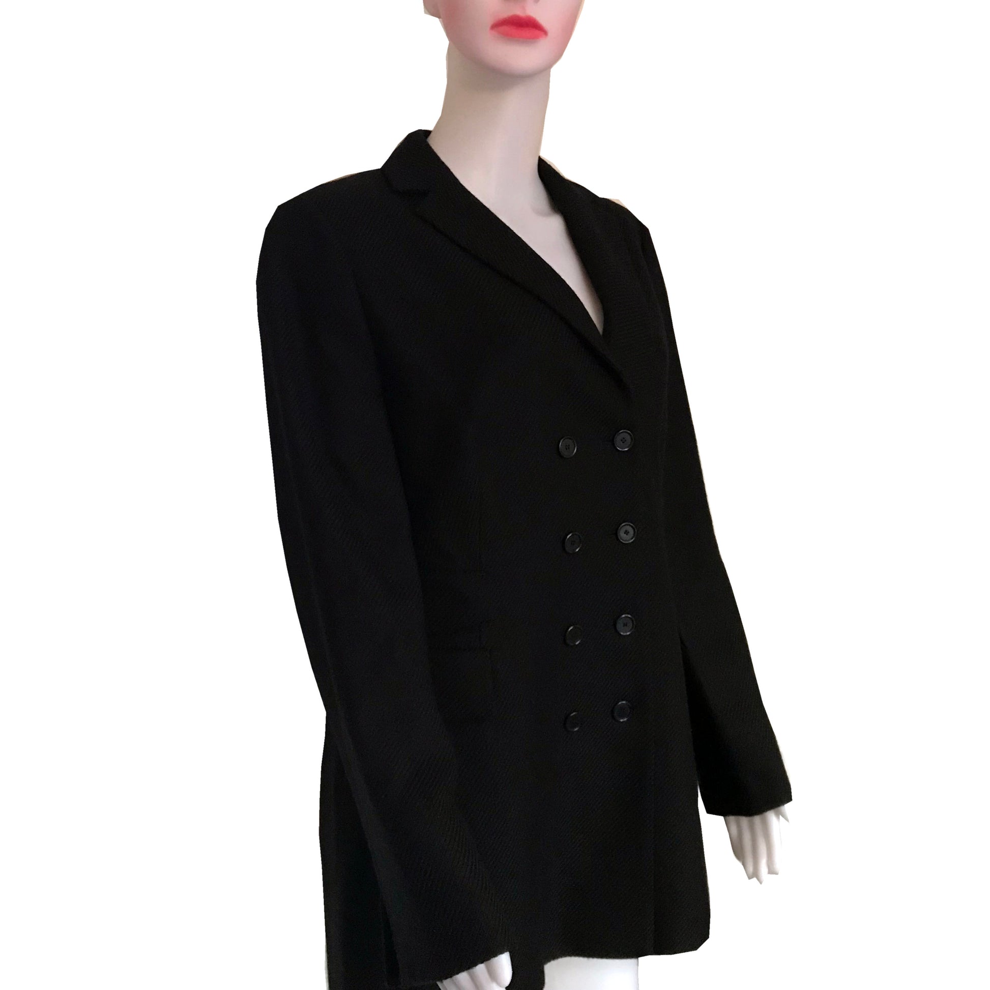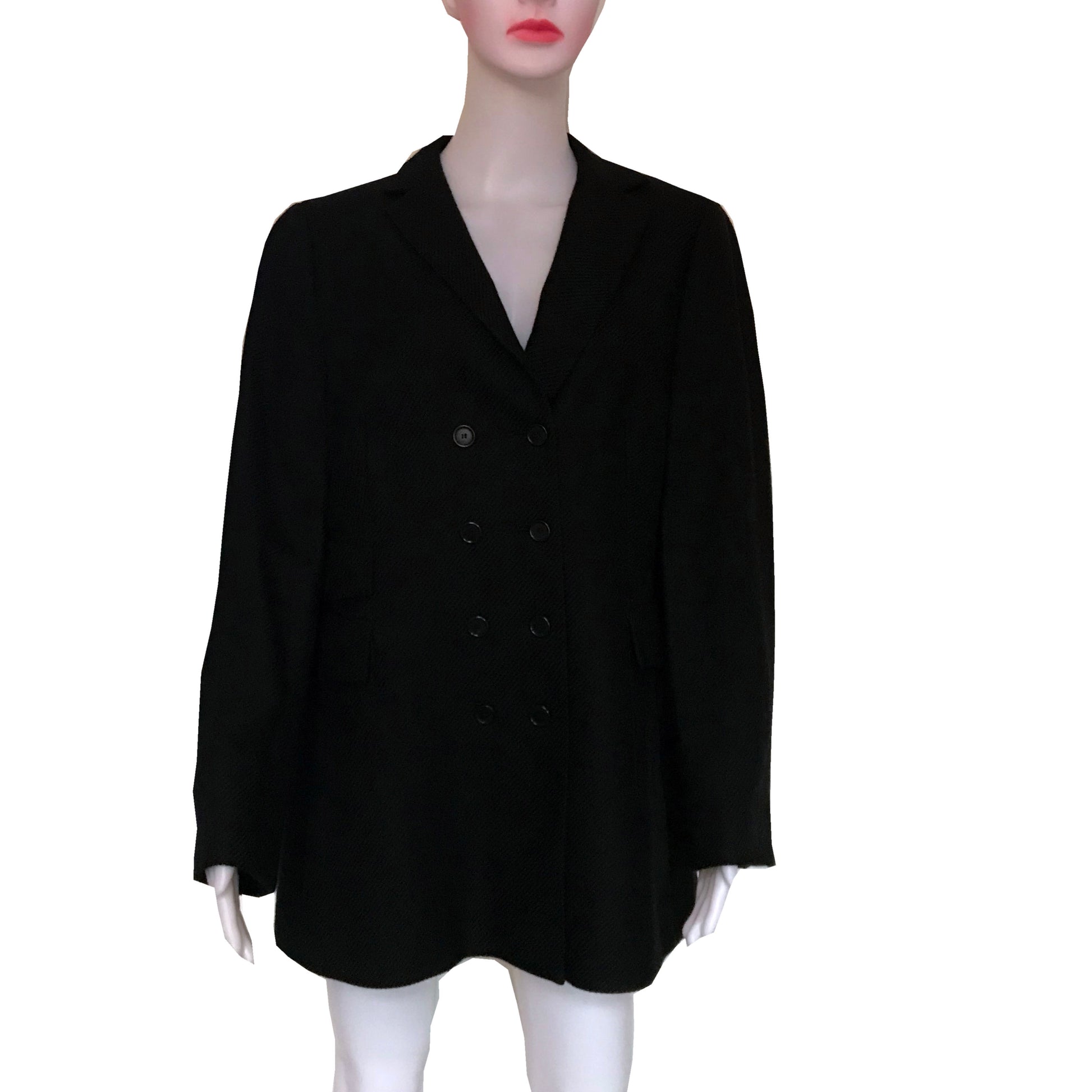 Vintage 1990s Akris Punto black wool coat with notch-lapels, flap pockets at front and double-breasted button closures. Size 14/XL
