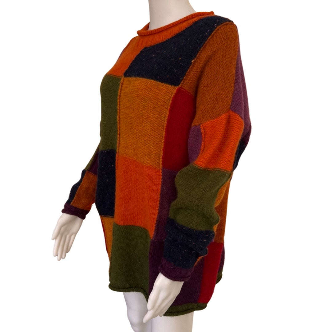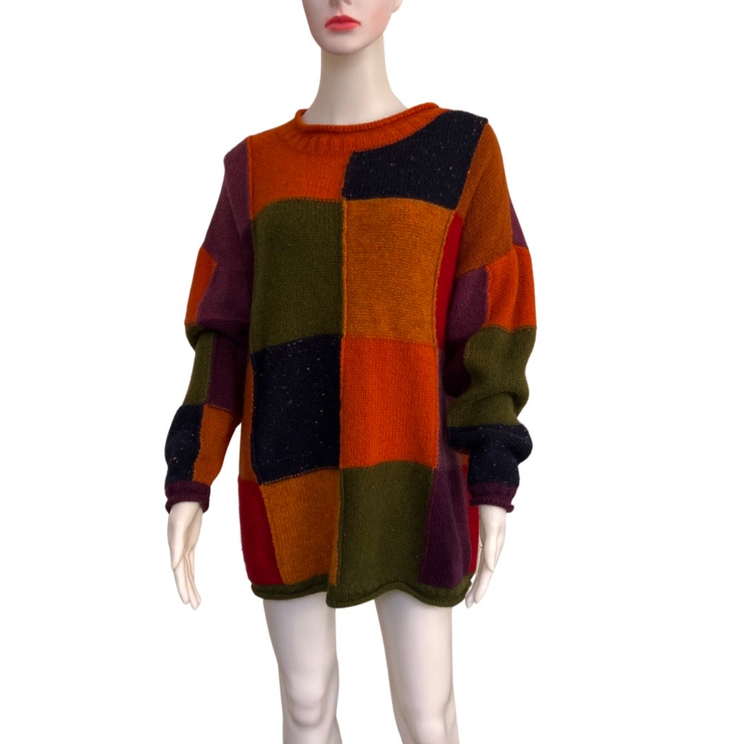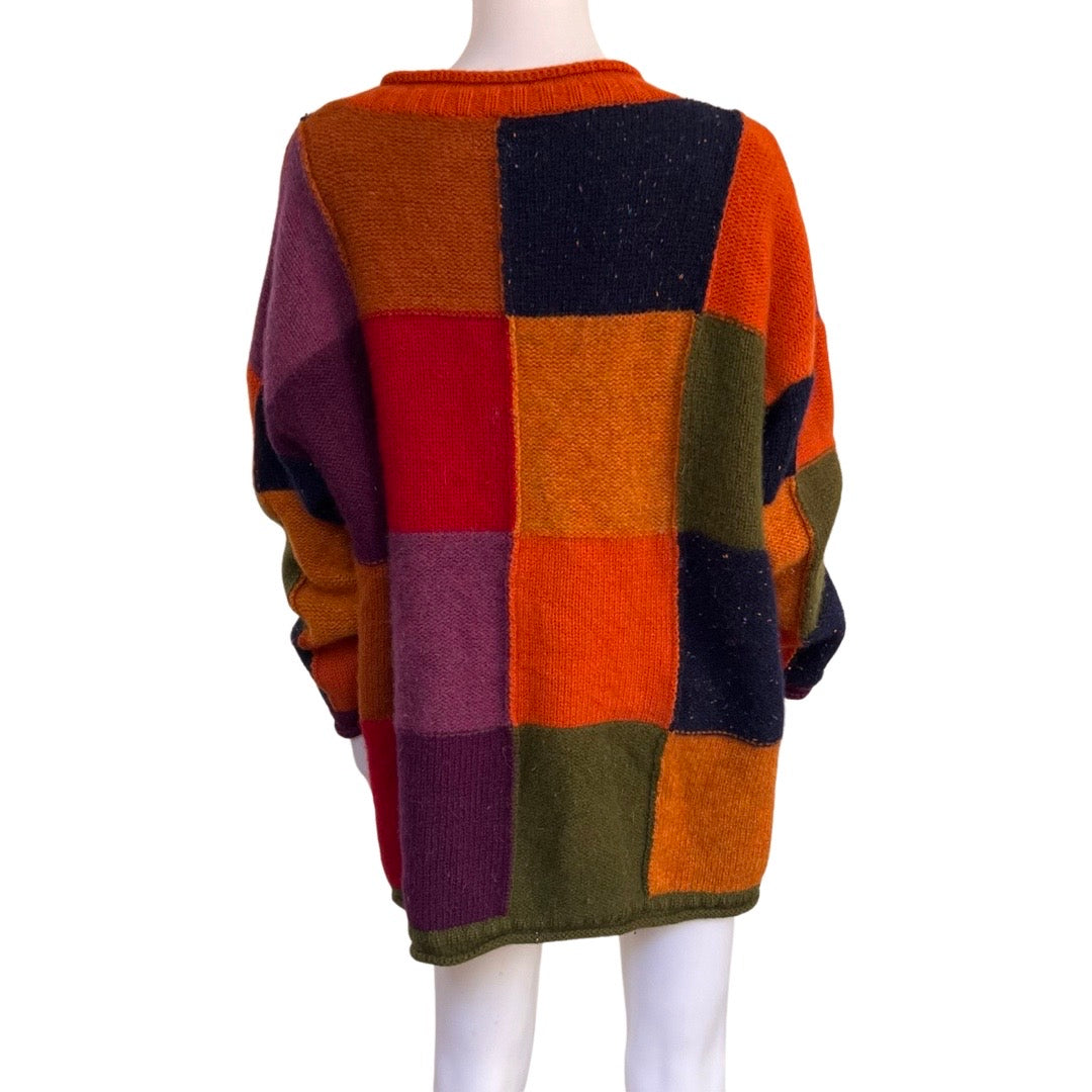 Square color-blocking pattern with orange, green, purple, gold and blue colors. Long sleeves. Crew neck. 100% wool material.