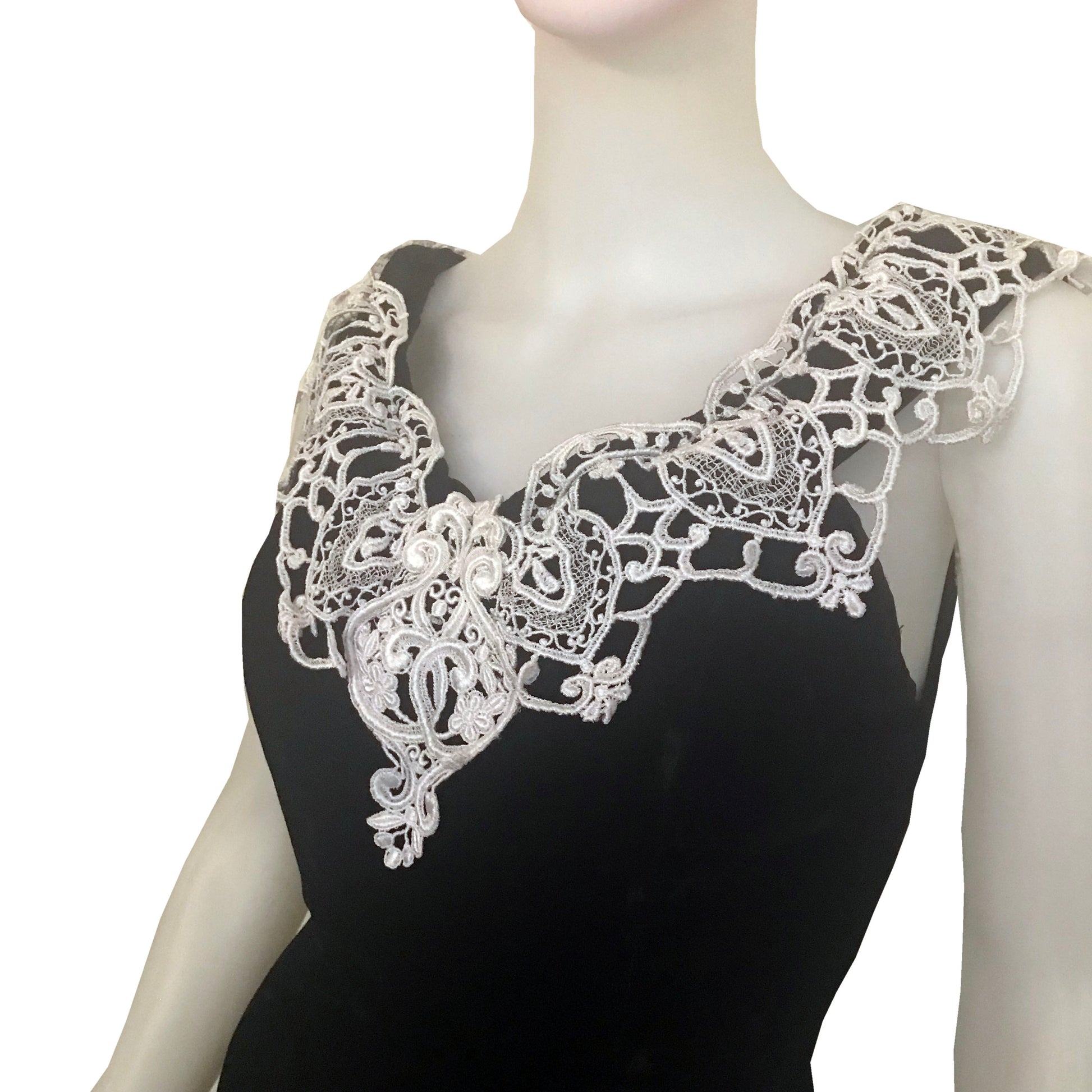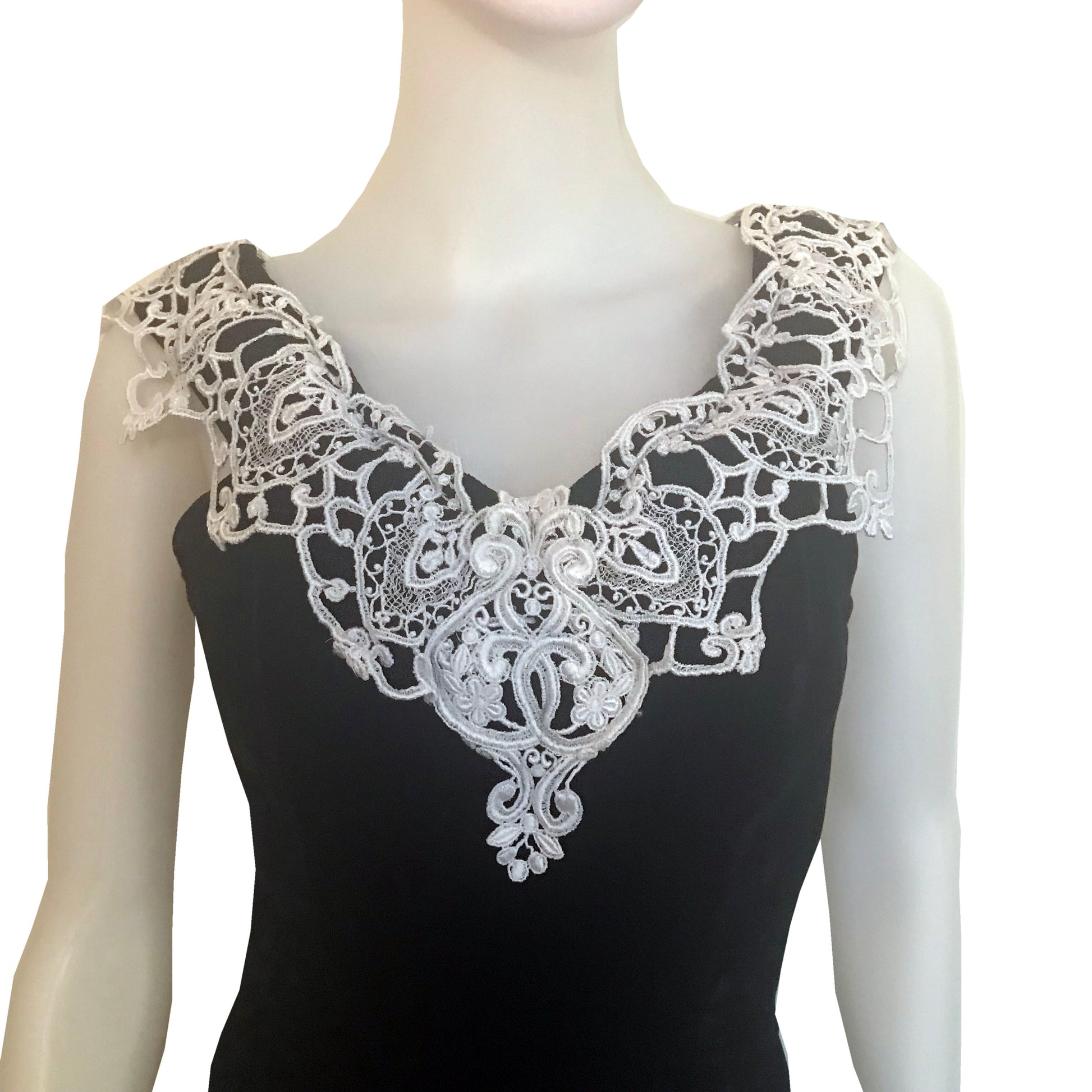 Stunning and rare vintage 1980s Gunne Sax black crushed velvet dress with white lace detailing and sexy thigh-high front slit. Size 0.