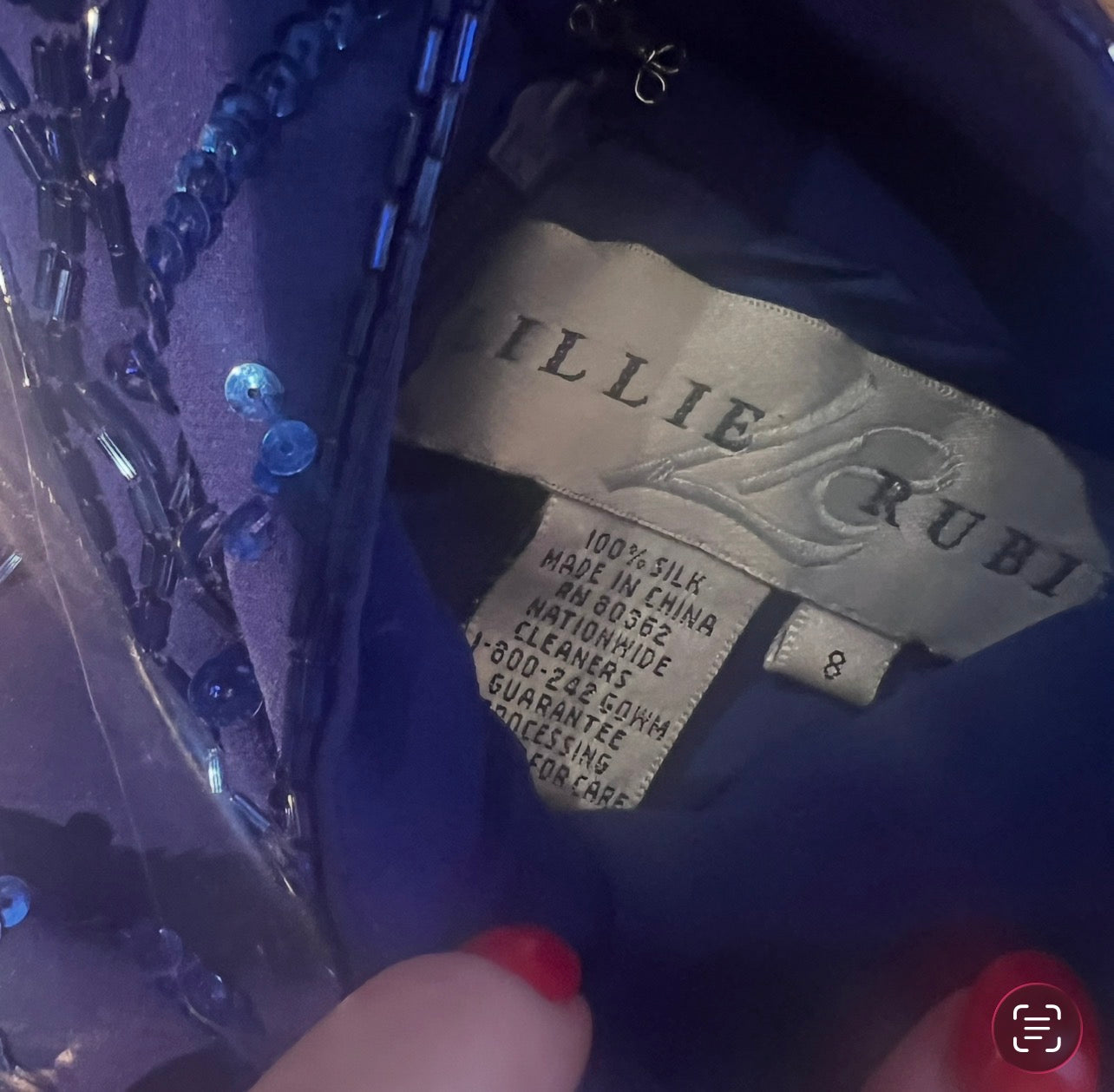 Gorgeous and rare navy blue silk sequined formal halter dress from Lillie Rubin circa 1980s. Sized 8 but runs small. See measurements below...